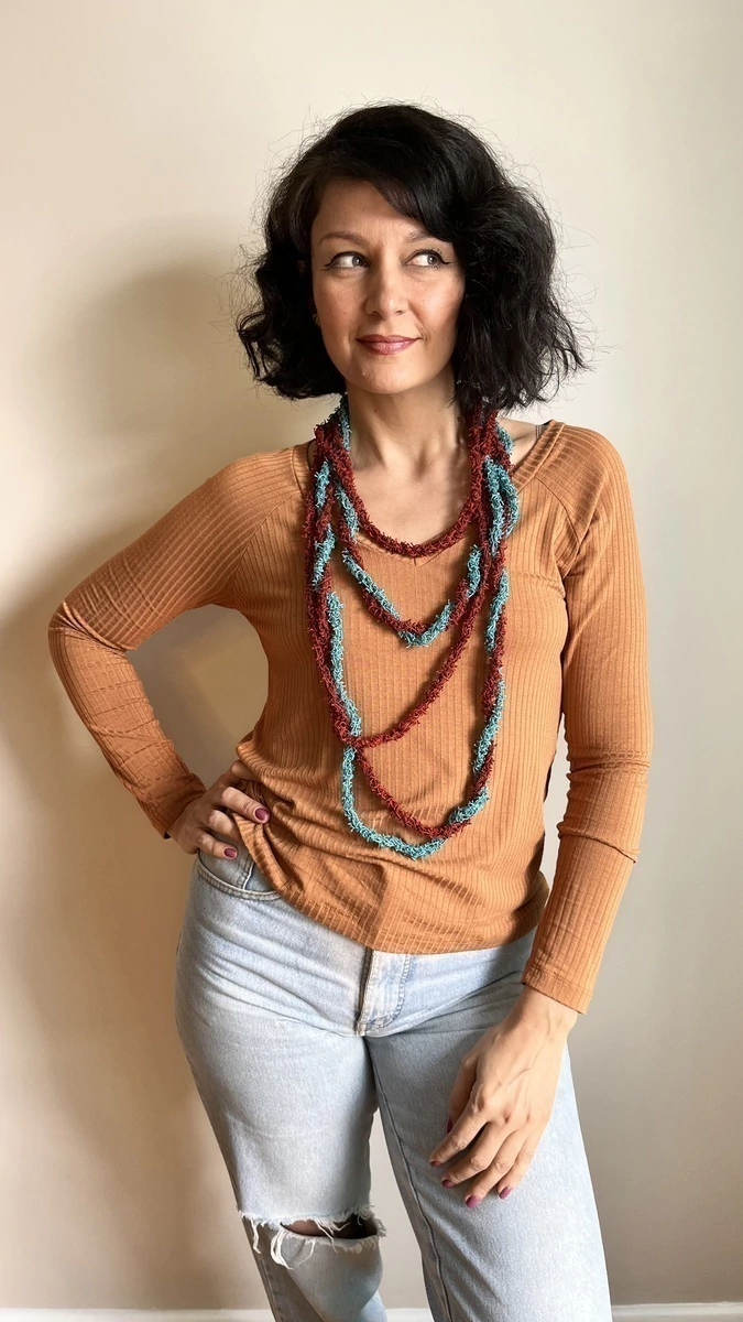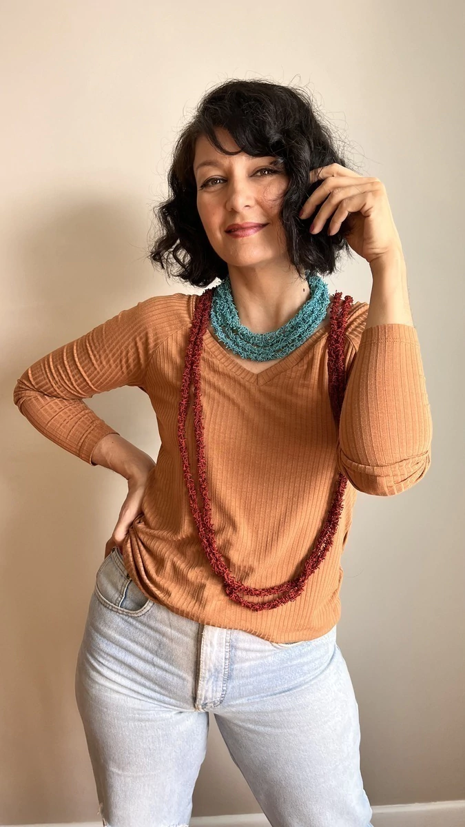 Feito à mão em crochê com rede de pesca reaproveitada, o Colar Rede é uma peça longa e versátil, criada pelas artesãs da Colônia Z3, em Pelotas (RS).